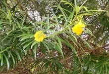 黄花夹竹桃K. Schum.),又名“酒杯花”“柳木子”“黄花状元竹”,是夹竹桃科,黄花夹竹桃属下的常绿乔木植物。高达5m,全株无毛,树皮棕褐色;叶互生,近革质,线形或线状披针形;花大,黄色,具香味,…全部>>