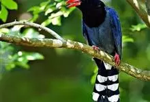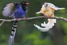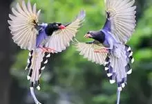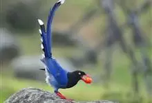 台湾蓝鹊:体长64至65厘米,翼展18至21厘米,尾长约40厘米,尾羽长占了总体长的三分之二。头、脸、颈、喉、胸都是黑色,黄色的眼珠包围黑色的瞳孔,鲜红色的鸟喙、双脚,…全部>>