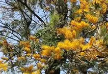 银桦,山龙眼科银桦属的常绿乔木,高可达10~25米。树皮暗灰色或暗褐色,具浅皱纵裂;枝被锈色绒毛;叶呈羽状,上面无毛或具稀疏丝状绢毛,下面被褐色绒毛和银灰色绢状毛,边缘背卷;花序排成少分枝的顶生圆锥状,…全部>>