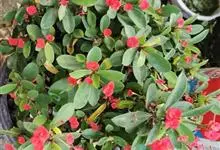 虎刺梅:别称铁海棠,是蔓生灌木植物。茎多分枝,长60-100厘米,直径5-10毫米,具纵棱,密生硬而尖的锥状刺,刺长1-1.5厘米,直径0.5-1.0 毫米,常呈3-5列排列于棱脊上,呈旋转。叶互生…全部>>