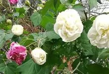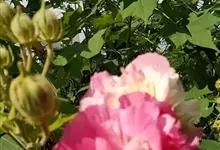 木芙蓉,锦葵科木槿属落叶灌木或小乔木。小枝上有细绒毛;叶片为卵状心形,托叶为披针形,常早落;花单生,花萼为钟形,花冠初为白色或淡红色,后逐渐变为深红色;果实为扁球形,有淡黄色的毛附着。花期8到10月。…全部>>