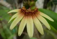 纹瓣兰 Sw.)附生植物,假鳞茎卵球形,通常包藏于叶基之内,叶4-5枚,厚革质,花葶从假鳞茎基部穿鞘而出,下垂,长20-60厘米,萼片与花瓣淡黄色至奶油黄色,萼片狭长圆形至狭椭圆形,花瓣略短于萼片,…全部>>