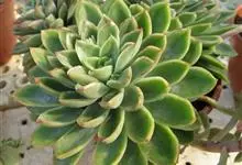 红缘莲花掌属蔷薇目、景天科植物,原产大西洋的加那利群岛。质厚,蓝绿色,被白霜,叶缘红褐色。聚伞花序,花浅黄色,有时带红晕。叶形叶色较美,有一定的观赏价值,多盆栽用于点缀室内;可放置于电视、电脑旁,…全部>>