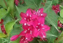 红王子锦带花是忍冬科锦带花属的落叶开张性灌木。株高1 -2米;嫩枝淡红色,老枝灰褐色;单叶对生,呈椭圆形,先端渐尖,叶缘有锯齿,红枝及叶脉具柔毛;花冠漏斗状钟形,花冠筒中部以下变细,聚伞花序,…全部>>