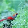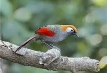 赤尾噪鹛中型鸟类,体长24~28厘米。头顶至后颈红棕色,两翅和尾鲜红色,眼先、眉纹、颊、颏和喉黑色,眼后有一灰色块斑。其余上下体羽大都暗灰或橄榄灰色。特征极明显,特别是通过鲜红色的头顶、翅和尾。…全部>>