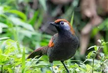 栗颈噪鹛是噪眉科、噪鹛属中型鸟类,体长22-25厘米。头顶至枕暗石板灰色,前额、头侧、颏、喉至上胸黑色,耳后至颈侧有一栗棕色块斑,在头后颈侧极为醒目。上体暗橄榄褐色,两翅黑褐色,初级飞羽外翈沾灰。…全部>>