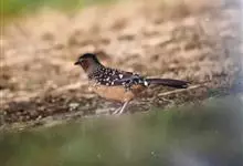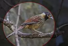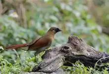 大噪鹛:中型鸟类,体长32-36厘米。额至头顶黑褐色,背栗褐色满杂以白色斑点,斑点前缘或四周还围有黑色。初级覆羽、大覆羽和初级飞羽具白色端斑。尾特长,均具黑色亚端斑和白色端斑。颏、喉棕褐色,…全部>>