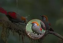 赤尾噪鹛中型鸟类,体长24~28厘米。头顶至后颈红棕色,两翅和尾鲜红色,眼先、眉纹、颊、颏和喉黑色,眼后有一灰色块斑。其余上下体羽大都暗灰或橄榄灰色。特征极明显,特别是通过鲜红色的头顶、翅和尾。…全部>>