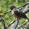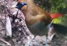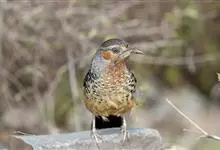 大噪鹛:中型鸟类,体长32-36厘米。额至头顶黑褐色,背栗褐色满杂以白色斑点,斑点前缘或四周还围有黑色。初级覆羽、大覆羽和初级飞羽具白色端斑。尾特长,均具黑色亚端斑和白色端斑。颏、喉棕褐色,…全部>>