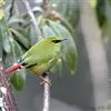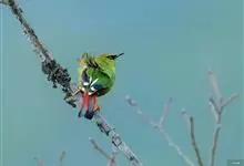 火尾绿鹛是莺科、绿鹛属小型鸟类,体长11-14厘米。上体绿色,头顶至枕具黑色鳞状斑,眼先和眼后黑色,眉纹黄绿色。两翅黑色具黄色和红色翅斑及白色端斑,极为醒目。中央一对尾羽绿色,外侧尾羽鲜红色。…全部>>