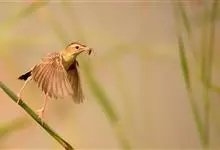 金头扇尾莺体小而具褐色纵纹的莺。嘴细长,略向下弯;翼短,体型娇小,尾长。下体皮黄,喉近白,尾深褐,尾端皮黄。雌雄羽色相近,羽色单调。繁殖期雄鸟顶冠亮金色,腰褐色。雌鸟及非繁殖期雄鸟头顶密布黑色细纹,…全部>>