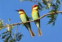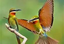 栗喉蜂虎是蜂虎科蜂虎属的鸟类。有热带鸟类羽毛艳丽的特征:喉部是栗红色的,黑色的过眼纹,翅膀和背部是绿色的,尾翼是蓝色的,飞行时翅膀下面的羽毛是橙黄色的,在阳光的照射下,它们全身闪烁着金属般的艳丽光泽,…全部>>