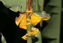 树蛙是树蛙科两栖动物的统称。树蛙体中等或大,一般雄蛙吻端斜尖,雌蛙吻端高钝;舌后端缺刻深,梨骨齿发达,鼓膜明显,指间有蹼或蹼发达,趾间近全满蹼,外侧跖较发达;鼻骨小、蝶筛骨显露,额顶宽或宽短,…全部>>