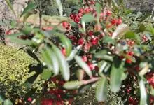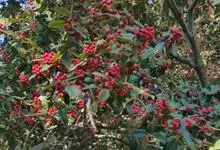 火棘 H. L. Li)是蔷薇科火棘属常绿灌木,老枝呈暗褐色;叶片呈倒卵形,边缘有钝锯齿,齿尖向内弯,两面皆无毛;叶柄短,无毛或嫩时有柔毛;花序是复伞房状,花瓣呈白色近圆形;果球近圆形,…全部>>