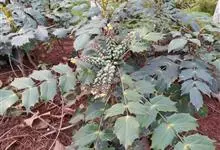 十大功劳 Fedde),小檗科十大功劳属常绿灌木植物。叶子较大且较多,呈椭圆形,绿色,表面光滑无毛,叶柄较长;花朵较小,呈多边形,黄色,花瓣对称分布,表面有绒毛;果实呈圆形,褐色,…全部>>