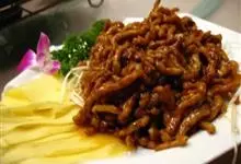 京酱肉丝,是一道知名度很高的菜肴,它是北京菜中的经典代表菜之一。制作时选用猪瘦肉为主料,辅以甜面酱、葱、姜及其它调料,用北方特有烹调技法“六爆”之一的“酱爆”烹制而成。 成菜后,咸甜适中,酱香浓郁…全部>>