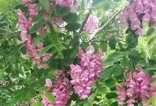 红花刺槐是豆科刺槐属的植物。其干皮深纵裂;枝具托叶刺,羽状复叶互生,叶片卵形或长圆形,具芒尖;基部圆形。花两性;总花序下垂;花冠粉红色,芳香;果条状长圆形,腹缝有窄翅。花期4~5月,果期9~10月。…全部>>
