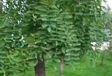 槐 Schott),豆科槐属的落叶乔木。树皮暗灰色,树冠球形,老时则呈扁球形或倒卵形。枝叶密生,羽状复叶。圆锥花序顶生,花蝶形,夏季开黄白色花,略具芳香。荚果肉质,念珠状不开裂,黄绿色,常悬垂树梢,…全部>>