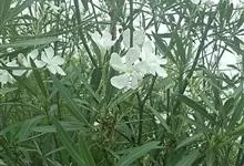 白花夹竹桃是夹竹桃科、夹竹桃属植物夹竹桃的栽培品种。常绿直立大灌木,枝条灰绿色;嫩枝条具稜,被微毛,老时毛脱落。叶3-4枚轮生,下枝为对生,叶面深绿,叶背浅绿色;侧脉纤细平行与中脉成直角;叶柄扁平,…全部>>