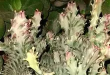 麒麟掌,是大戟科大戟属多年生植物。为金刚纂的带化变异变种。麒麟掌的株乳汁丰富;它的茎圆柱状,上部多分枝,绿色;叶互生,稀少,常生于嫩枝顶端脊上,倒卵形、倒卵状长圆形或匙形,顶端钝圆,具小凸尖,全缘,…全部>>