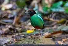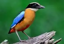 绿胸八色鸫:是雀形目八色鸫科的鸟类,共有12个亚种。体长为16-18厘米,体重65-69克。体型圆胖,尾短,腿长。头黑,上体绿色,两翼深色而具白色斑纹,头顶至后枕深褐,胸及腹部苹果绿,臀亮红。…全部>>