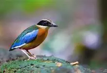 蓝八色鸫是雀形目八色鸫科的鸟类,体长约24厘米,体重109克左右。体型圆胖,尾短,腿长。羽色鲜艳,头顶两侧橘黄色的宽带延伸至颈背,宽宽的过眼纹黑色,脸颊皮黄,髭纹黑,尾亮蓝色。雌鸟较雄鸟色暗,…全部>>
