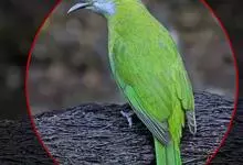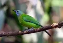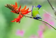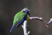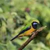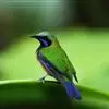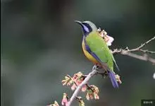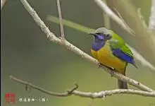 橙腹叶鹎体形大小和金额叶鹎相似,体长16~20厘米。额至后颈黄绿色,其余上体绿色,小覆羽亮钴蓝色,形成明显的肩斑。颏、喉、上胸黑色具钴蓝色髭纹,其余下体橙色。飞羽和尾羽雄鸟黑色、雌鸟绿色。…全部>>