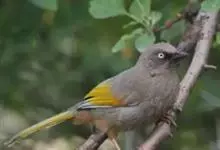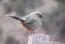 橙翅噪鹛:是噪鹛科、彩翼噪鹛属的中型鸟类,体长22-25厘米。头顶深葡萄灰色或沙褐色。上体灰橄榄褐色,外侧飞羽外翈蓝灰色、基部橙黄色,中央尾羽灰褐色,外侧尾羽外翈绿色而缘以橙黄色并具白色端斑。…全部>>