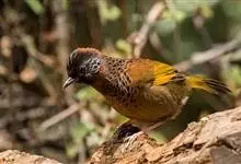 蓝翅噪鹛:噪鹛科、彩翼噪鹛属动物。中型鸟类,体长22-25厘米。上体棕橄榄褐色密被黑色鳞状斑,眼蓝白色,眼上有一长而宽阔的黑色眉纹,从眼先直到颈侧。下体棕褐色被黑色鳞状斑;尾上和尾上覆羽栗色,…全部>>