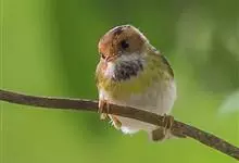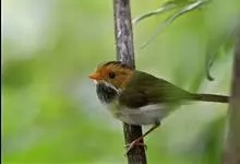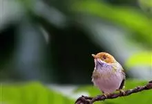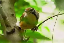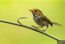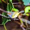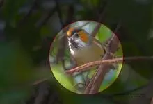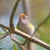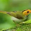 棕脸鹟莺:体长10厘米,是一种色彩亮丽而有特色的莺鸟。头栗色,具黑色侧冠纹。上体绿,腰黄色。下体白,颏及喉杂黑色点斑,上胸沾黄。与栗头鹟莺的区别在头侧栗色,白色眼圈不显著且无翼斑。…全部>>