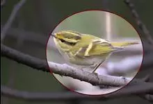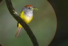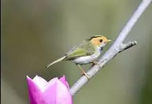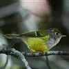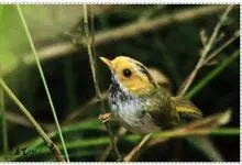 黑脸鹟莺:体长10厘米,是有特色的体小而多彩的莺鸟。粗眉纹,颏、喉及尾下覆羽黄色,脸罩黑,头顶及颈背灰色,上体绿,无翼纹,腹白。虹膜褐色;上嘴色深,下嘴肉色;脚偏绿色。…全部>>