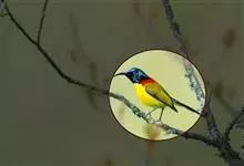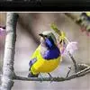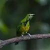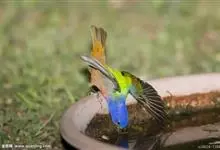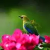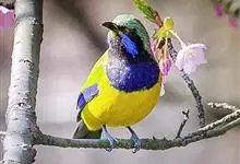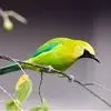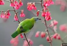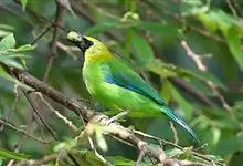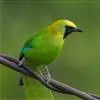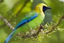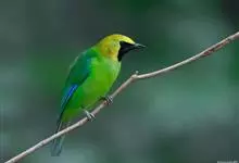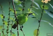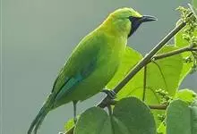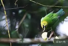 蓝翅叶鹎:小型鸟类,体长15-18厘米。雄鸟通体草绿色,尾蓝绿色,肩和翅亮蓝 色,胸缀有黄色,颏、喉黑色。雌鸟颏,喉蓝绿色。栖息在海拔1500米以下的常绿阔叶林、次生林和林缘疏林灌丛中。…全部>>