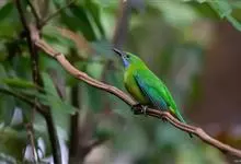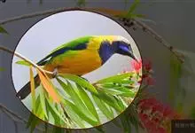 蓝翅叶鹎:小型鸟类,体长15-18厘米。雄鸟通体草绿色,尾蓝绿色,肩和翅亮蓝 色,胸缀有黄色,颏、喉黑色。雌鸟颏,喉蓝绿色。栖息在海拔1500米以下的常绿阔叶林、次生林和林缘疏林灌丛中。…全部>>