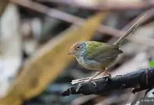 普通缝叶莺,是雀形目鹅科莺亚科缝叶莺属一种。体长10-14厘米,体重7-10克,雄鸟前额棕红,头顶至枕棕橄榄褐,上体橄榄绿染黄,飞羽及尾羽暗褐;繁殖期雄鸟的中央尾羽特形延长,下体淡皮黄白色。…全部>>