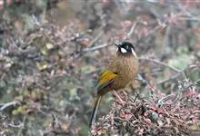 黑顶噪鹛:中型鸟类,体长24-26厘米。前额、脸、颏、喉黑色,头顶黑褐沾棕或深棕橄榄褐色,背栗褐或棕褐色,颧斑白色或棕红色,眼后缘和颈侧亦具白斑,飞羽金黄橄榄色而具蓝灰色尖端。下体淡棕褐色。…全部>>
