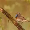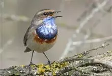 蓝点颏亦称“蓝喉歌鸲”,通称蓝靛颏儿。身体大小和麻雀相似,体长12-13厘米,体重17-18克。头部、上体主要为土褐色。眉纹白色。尾羽黑褐色,基部栗红色。颏部、喉部辉蓝色,下面有黑色横纹。下体白色。…全部>>