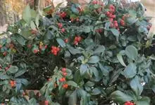 火棘 H. L. Li)是蔷薇科火棘属常绿灌木,老枝呈暗褐色;叶片呈倒卵形,边缘有钝锯齿,齿尖向内弯,两面皆无毛;叶柄短,无毛或嫩时有柔毛;花序是复伞房状,花瓣呈白色近圆形;果球近圆形,…全部>>