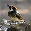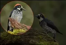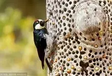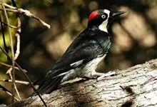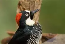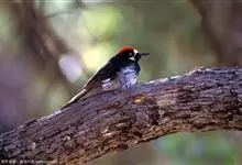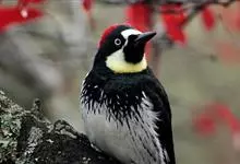 橡树啄木鸟:体长20-23厘米。前额灰黄色,头顶、后颈红色。喉下部、腰和腹部白色,腹部有细的黑色纵条纹。其余体羽为黑色。嘴黑色。腿、脚暗灰色。栖息于山区林地中。结群活动。以昆虫以及植物坚果、果实等为食。…全部>>