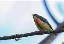 黄腹啄花鸟:体重11-16克,体长104-117毫米。是一种体型大,下腹部为艳黄色的啄花鸟,雄鸟特征为头黑色,喉部有白色纵斑、喉侧及上体成对比,两翅和尾黑色,外侧尾羽内翈具白色斑块。其余下体淡黄色。…全部>>
