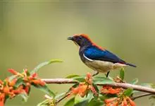 朱背啄花鸟:体重6-8克,体长81-97毫米。是一种小型的黑色及红色啄花鸟。雄鸟顶冠、背及腰猩红色,两翼、头侧及尾黑,两胁灰,下体余部白色。雌鸟上体橄榄色,腰及尾上覆羽猩红,尾黑。亚成鸟清灰色,嘴橘黄,…全部>>