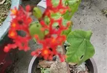 佛肚树是大戟科麻风树属的直立灌木。株高可达1.5米;茎基部或下部通常膨大呈瓶状;枝条粗短,具散生突起皮孔;叶盾状着生,近圆形或宽椭圆形,先端圆钝,基部平截或钝圆,托叶分裂呈刺状,宿存;花序顶生,…全部>>