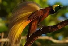 大极乐鸟是极乐鸟属中最大的鸟种。成年雄鸟体长可达到43厘米,雌性可达35厘米。雄鸟的额、颊、喉等墨绿色;头、颈黄色;上体暗赤栗色;腹部葡萄红色,胁部有长饰羽,其基部橙黄,中部黄色,…全部>>