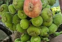 大果榕是桑科榕属的小乔木,株高可达10米;幼枝被柔毛;叶互生,宽卵状心形或近圆形;雄花无梗、匙形、花丝长,雌花生于雌株榕果内,子房白色;榕果簇生于树干基部或老茎短枝上、扁球形或陀螺形,…全部>>