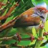 普通缝叶莺,是雀形目鹅科莺亚科缝叶莺属一种。体长10-14厘米,体重7-10克,雄鸟前额棕红,头顶至枕棕橄榄褐,上体橄榄绿染黄,飞羽及尾羽暗褐;繁殖期雄鸟的中央尾羽特形延长,下体淡皮黄白色。…全部>>