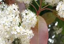 石楠 Kalkman),是蔷薇科石楠属的常绿乔木,高5~12米,株型紧凑,树冠圆球形。树枝为褐灰色;鳞片为褐色,没有毛;叶片革质,长椭圆至侧卵状椭圆形,有锯齿,新叶红色光亮。复伞房花序,白色小花,…全部>>