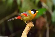 银耳相思鸟小型鸟类,体长14~18厘米。头顶黑色,耳羽银灰色,前额橙黄色;外侧飞羽橙黄色,基部朱红色,极为鲜艳、醒目。尾圆形,尾上、尾下覆羽朱红色,尾暗灰褐色,外侧尾羽橙黄色,其余上体橄榄绿或橄榄黄色。…全部>>