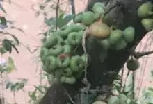 大果榕是桑科榕属的小乔木,株高可达10米;幼枝被柔毛;叶互生,宽卵状心形或近圆形;雄花无梗、匙形、花丝长,雌花生于雌株榕果内,子房白色;榕果簇生于树干基部或老茎短枝上、扁球形或陀螺形,…全部>>