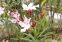 白花夹竹桃是夹竹桃科、夹竹桃属植物夹竹桃的栽培品种。常绿直立大灌木,枝条灰绿色;嫩枝条具稜,被微毛,老时毛脱落。叶3-4枚轮生,下枝为对生,叶面深绿,叶背浅绿色;侧脉纤细平行与中脉成直角;叶柄扁平,…全部>>