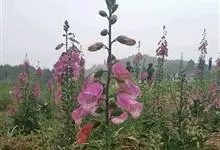 毛地黄是车前科、毛地黄属一年生或多年生草本植物。株高0.5—1米,茎直立,少分枝,全株被灰白色短柔毛和腺毛叶基生,呈莲座状,卵圆形或卵状披针形。顶生总状花序,花冠钟状,紫红色,内面有浅白斑点。菊果卵形。…全部>>