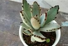 褐斑伽蓝是景天科伽蓝菜属的多年生多肉类植物,茎直立,多分枝,叶生于枝上,肉质叶片匙形,上面密被白色绒毛,下部全缘,叶缘上部有缺刻,缺刻处有深褐或棕色斑块。褐斑伽蓝原产非洲的马达加斯加岛。…全部>>